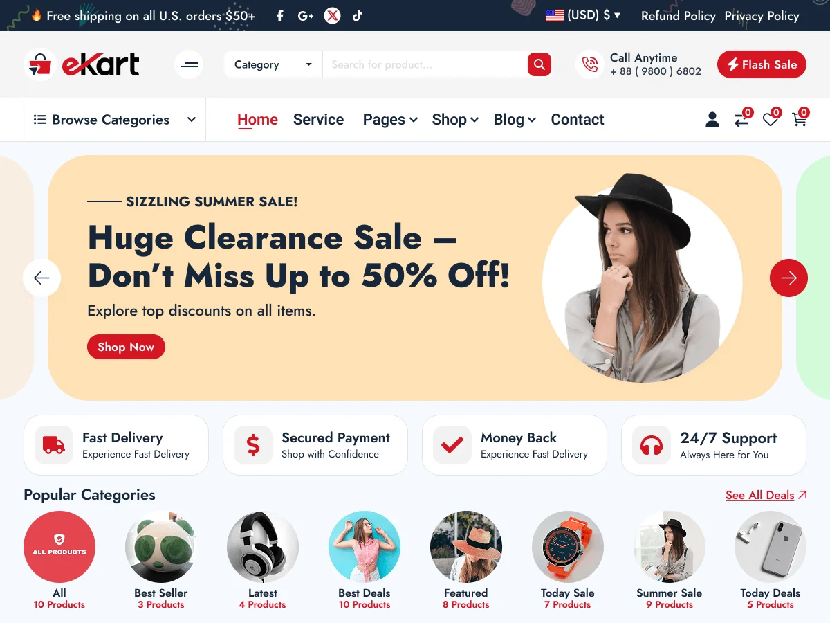 eKart — это быстрая и адаптивная тема WooCommerce для интернет-магазинов одежды, электроники и мультивендорных площадок. Её современный дизайн легко настраивается под различные типы товаров и услуг. Тема оптимизирована для мобильных устройств и обеспечивает удобный покупательский опыт. Это решение подходит для создания эффективных платформ электронной коммерции.