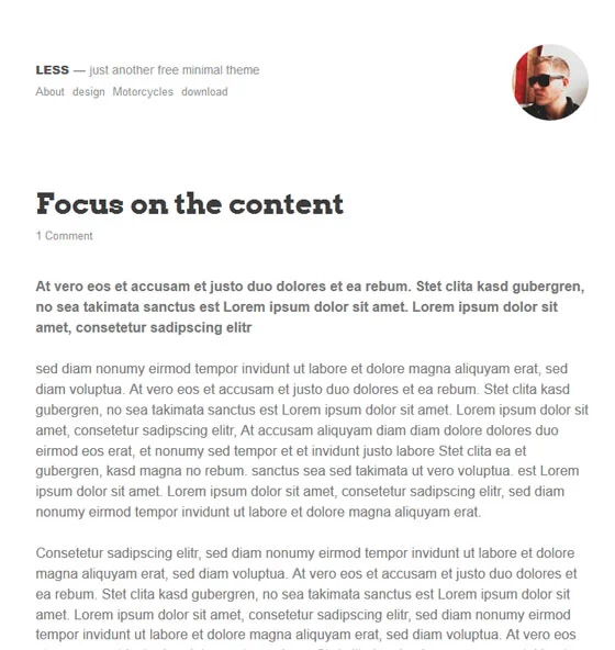 Тема Less представляет собой элегантное минималистичное решение с безупречной адаптивной версткой, специально разработанное для портативных устройств. Чистый и лаконичный дизайн позволяет контенту оставаться главным элементом страницы, не отвлекая пользователя на лишние детали.