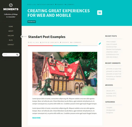 Moments — качественный адаптивный шаблон с фиксированной левой колонкой, идеально подходящий для личных блогов. Его лаконичный дизайн фокусирует внимание на контенте, обеспечивая удобное чтение. Гибкие настройки позволяют легко адаптировать макет под индивидуальные предпочтения. Шаблон корректно отображается на всех устройствах