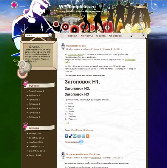 Шаблон Rocking Youth для WordPress посвящён музыкальной тематике и отличается приятным, атмосферным дизайном. В шапке сайта — динамичная иллюстрация: диджей за пультом и энергично танцующие люди. В футере размещён графический элемент в виде барабана. Сайдбар находится слева, а перед заголовками страниц изображён романтический коктейль, добавляющий изюминку в общую стилистику.
