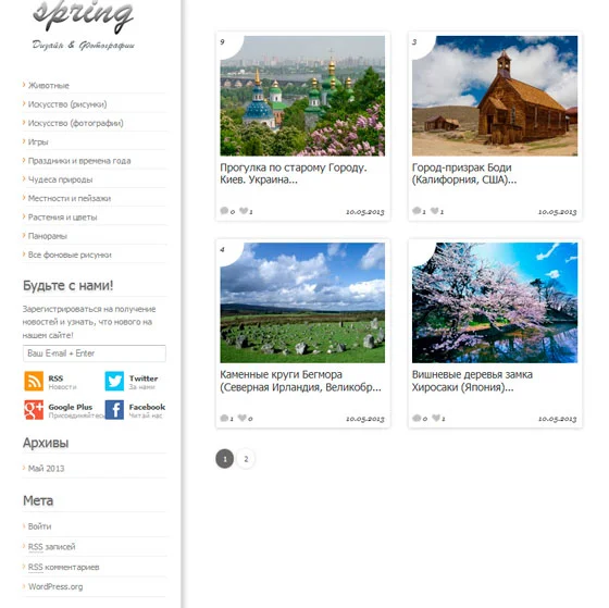 Тема Spring для WordPress — шаблон для творческих проектов. В комплекте идет обязательный к установке плагин wizylike. Адаптивный дизайн для удобного просмотра работ. Идеальное решение для художников, фотографов и дизайнеров.