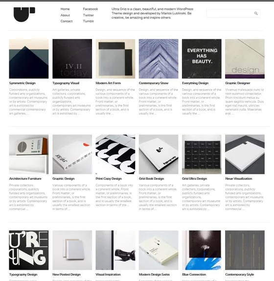 Шаблон Ultra Grid имеет два меню в заголовке. В теме есть небольшое меню с настройками, в котором можно указать логотип, цвет фона, текст заголовка. Записи на главной странице выводятся из категории, помеченной как «featured small».
