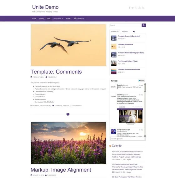 Unite - Unite — шаблон в необычных сиреневых оттенках с экстравагантным дизайном для блогов
